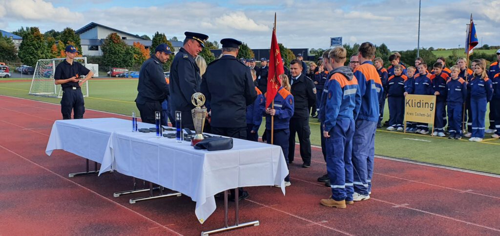Die Jugendfeuerwehr Kliding-Beuren sicherte sich mit 1.408 Punkten den ersten Platz und qualifizierte sich damit gemeinsam mit der Jugendfeuerwehr Lutzerath, die 1.394 Punkte erreichte, für die Deutsche Meisterschaft im Bundeswettbewerb im kommenden Jahr in Hannover.